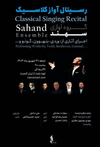 به گزارش سینا از روابط عمومی بنیاد رودکی، گروه سهند در کنسرت پیش رو با اجرای قطعاتی از لودویگ فان بتهوون، جوزپه وردی، ژرژ بیزه، شارل گونو، گابریل فوره و … میزبان علاقهمندان آواز کلاسیک میشوند.
