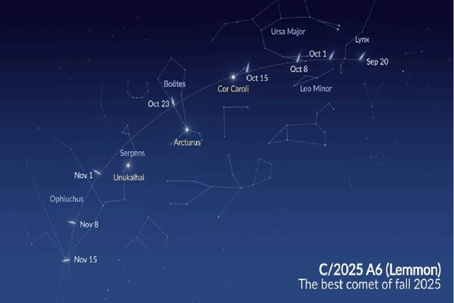عتیقی ادامه داد: ماه گذشته دنبالهدار Lemmon A6 به سرعت روشنتر شد و نزدیک شدن به خورشید باعث افزایش فعالیت و درخشش آن شد. این روشن شدن، احتمال دیدن آن را حتی بدون ابزار در این شبها، آن هم در مناطق تاریک و عاری از غبار و آلودگی نوری افزایش داده است. در نزدیکترین گذر این دنبالهدار از نزدیک زمین، جای آن در آسمان تغییر کرده و در افق شامگاهی به سمت افق شمالغرب، در زمینه صورت فلکی گاوران (عوّا – Bootes) که به آن بادبادک هم میگویند، قرار دارد؛ صورت گاوران بین صور فلکی خرس بزرگ (دُباکبر) و خوشه (سنبله) جا خوش کرده است و در ادامه مسیر از زیر صورتفلکی بزرگ مار (Serpens) عبور خواهد کرد، به نحوی که شاید این دنبالهدارهای زیبا را با چشم غیرمسلح و یا دوربین دوچشمی و تلسکوپ کوچک بتوانید ببینید.