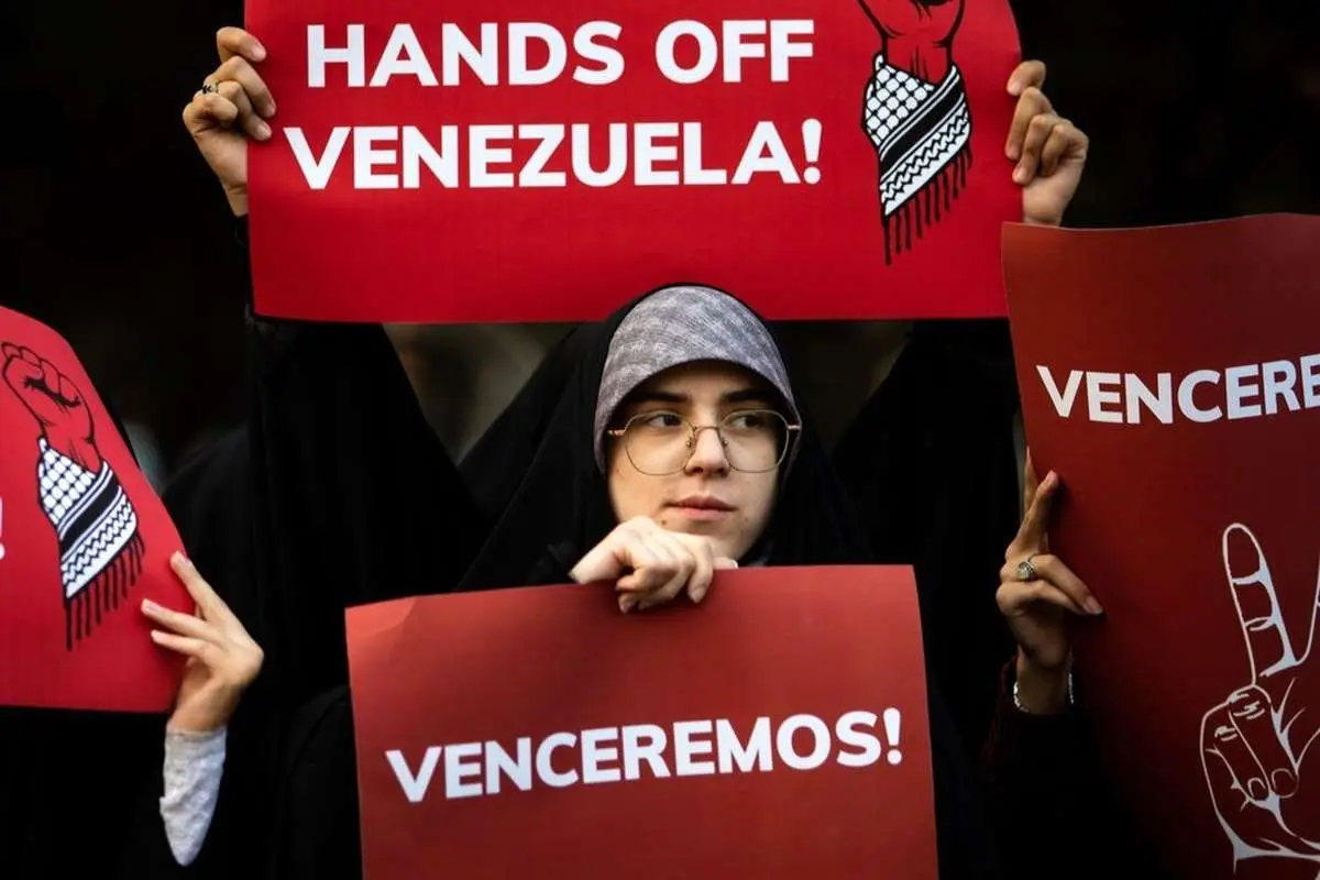 تجمع دانشجویی علیه آمریکا در محکومیت سیاست‌های این کشور علیه ونزوئلا بعد از ظهر پنجشنبه ۲۹ آبان ماه ۱۴۰۴ در مقابل دفتر حافظ منافع آمریکا در تهران برگزار شد