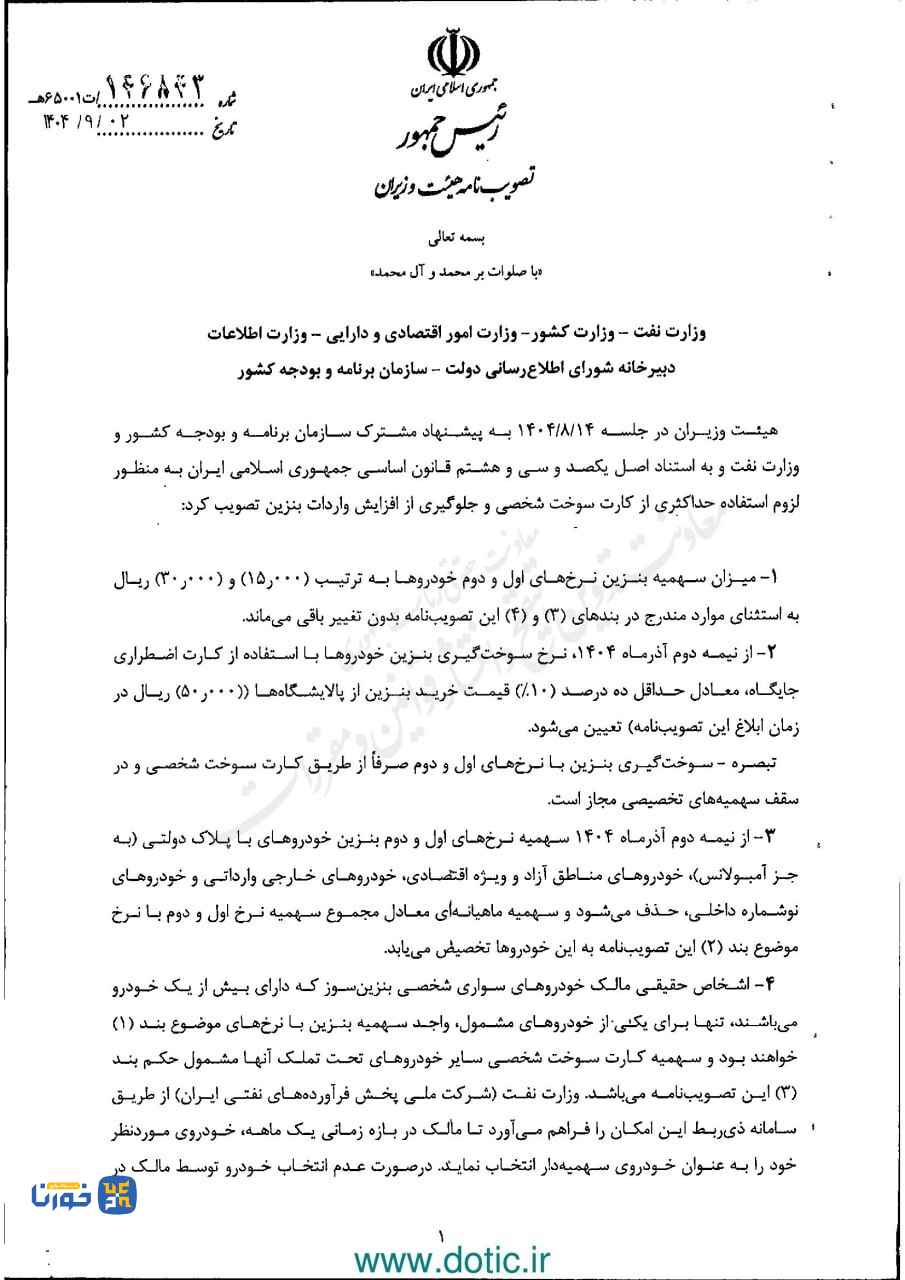 همچنین اشخاص دارای بیش از یک خودرو، فقط برای یک خودرو سهمیه اول و دوم بنزین را خواهند داشت و مابقی به نرخ سوم تعیین میشود. نرخ اول براساس سهمیه ماهانه ۱۵۰۰ تومان و نرخ دوم نیز ۳ هزار تومان خواهد بود.