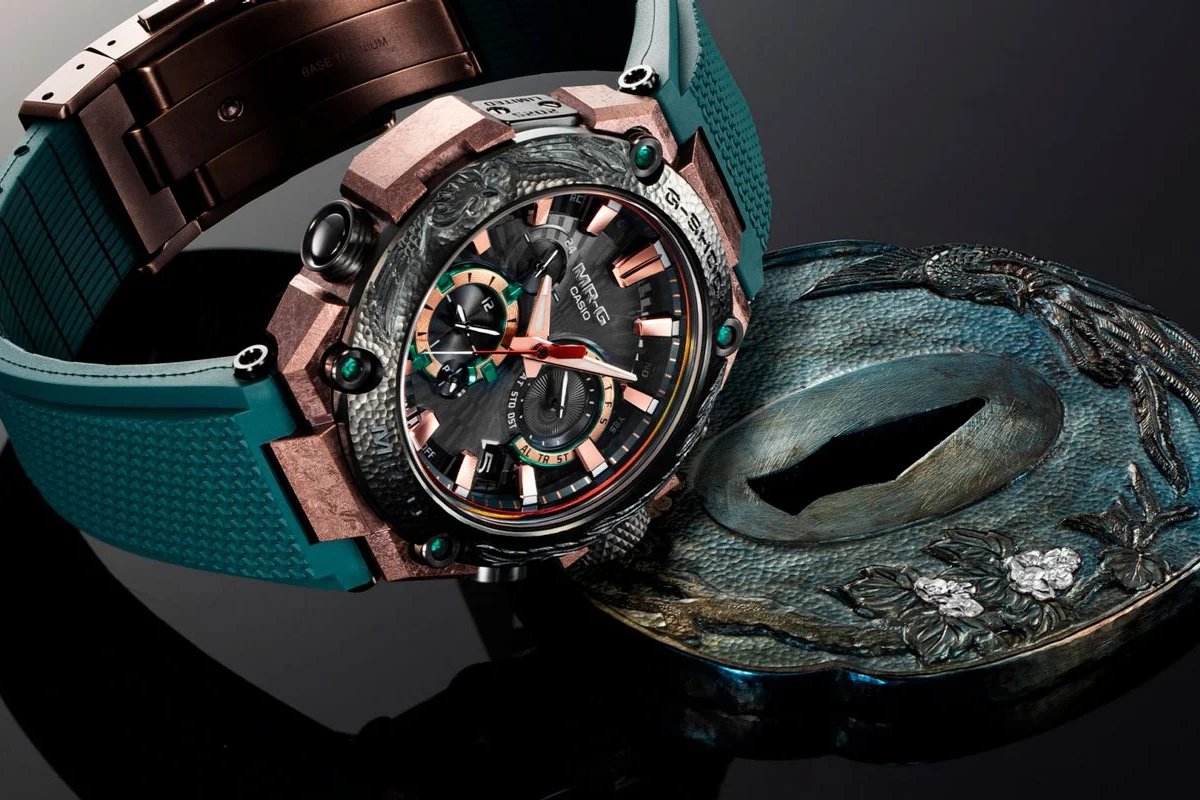 طراحی ساعت مردانه کاسیو مدل جیشاک MRG-B2000KT-3A از تسوبا (دستهی محافظی که بین تیغه و دستهی شمشیر قرار میگیرد) الهامگرفته است. حاشیهی ساعت با حکاکی فینیکس تزئین شده است که با تکنیک سنتی چکشکاری موسوم به شیشی-آیبوری به صورت دستی انجام میشود. هر طرح فینیکس با دقت و به صورت دستی بر روی آن حکاکی شده است و هیچ دو قطعهای مشابه نیستند.