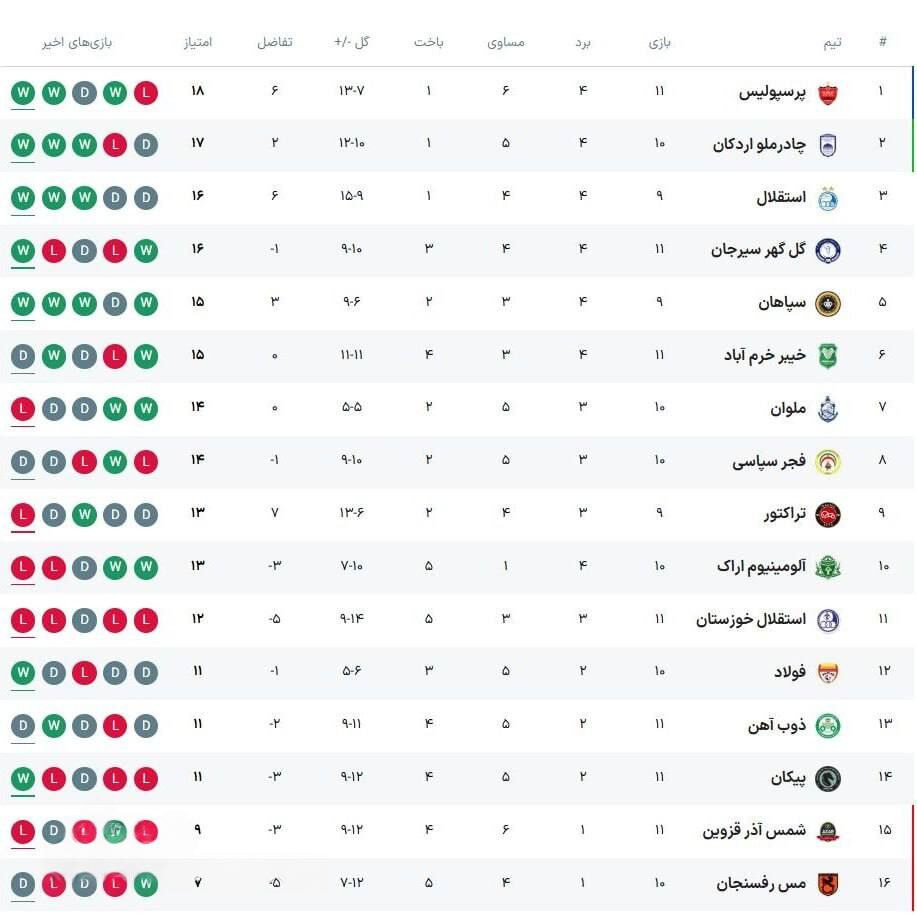 به گزارش آرمان ملی آنلاین ؛ رقابت‌های لیگ برتر ایران از هفته یازدهم امروز با ۴ دیدار پیگیری شد که در مهم‌ترین بازی تیم‌های فوتبال پرسپولیس و شمس آذر قزوین به مصاف یکدیگر رفتند که در پایان شاگردان اوسمار ویرا مقابل شاگردان وحید رضایی به برتری دو بر یک رسیدند. پرسپولیس با این پیروزی ۱۸ امتیازی و موقتا صدرنشین شد. شمس آذر با ثبت چهارمین شکست فصل ۹ امتیازی باقی ماند و در رتبه پانزدهم قرار گرفت.