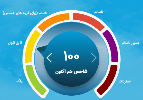 بر اساس تقسیمبندی شاخص کیفیت هوا، بازه صفر تا ۵۰ هوای پاک، ۵۱ تا ۱۰۰ قابل قبول، ۱۰۱ تا ۱۵۰ ناسالم برای گروههای حساس، ۱۵۱ تا ۲۰۰ ناسالم، ۲۰۱ تا ۳۰۰ بسیار ناسالم و ۳۰۱ تا ۵۰۰ بسیار خطرناک محسوب میشود.