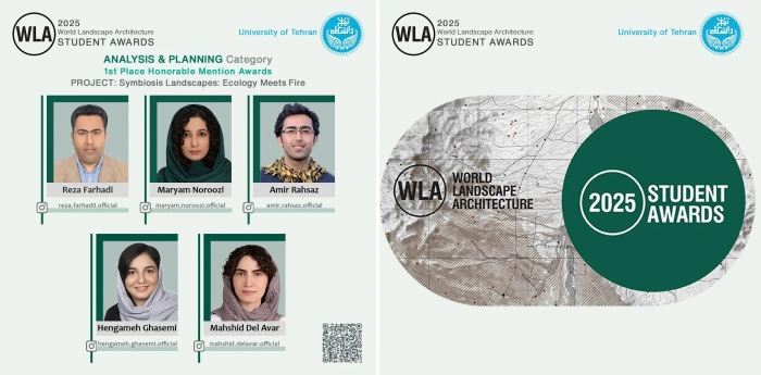 تیم دانشگاه تهران در جایزه جهانی معماری منظر سال ۲۰۲۵، با حضور ۱۶۱ تیم دانشگاهی از ۳۰ کشور برگزار شد، رتبه نخست بخش «جوایز افتخار» را کسب کرد.