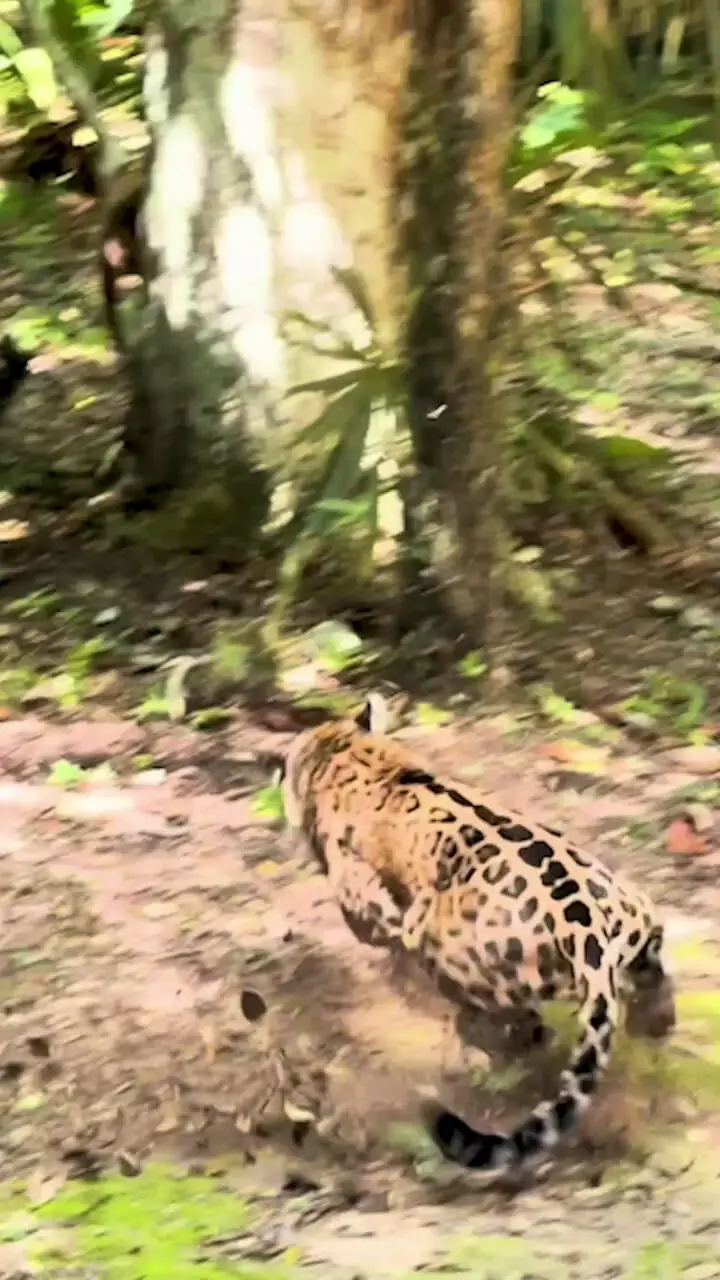 یک جگوار با حمله‌ای ناگهانی به گروهی از کواتی‌ها، شکار تازه‌اش را گرفت و به‌سرعت به درون جنگل گریخت.