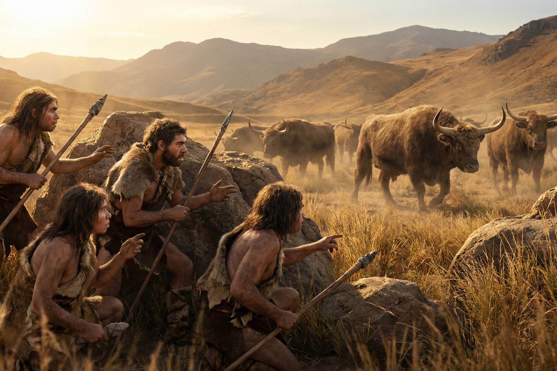 شکار موفقیتآمیز یک گله اروخص، گاوهای وحشی عظیمالجثهای که اکنون منقرض شدهاند، نیازمند هماهنگی و همکاری پیشرفته میان انسانهای باستانی بود. این سطح از مهارت سازمانی که تنها حدود ۵۰ هزار سال پیش گسترش یافت، به مثابه مزیتی تکاملی عمل کرد و ممکن است نقشی کلیدی در بقای انسان خردمند (Homo sapiens) و انقراض نئاندرتالها ایفا کرده باشد.
